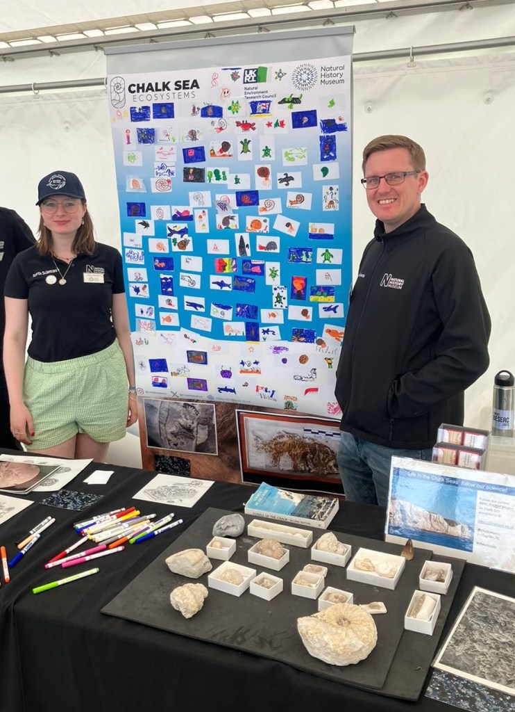 Harriet Bohun and Dr James Witts conducting public outreach on Chalk Sea Ecosystems at the Lyme Regis Fossil Festival, 2024.